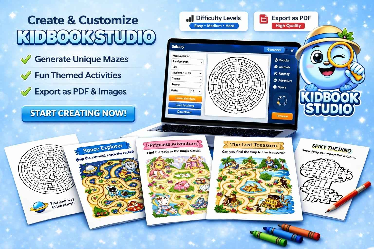KidBook Studio introduces Illustrated Maze AI, allowing users to generate visually engaging mazes integrated into themed illustrations.